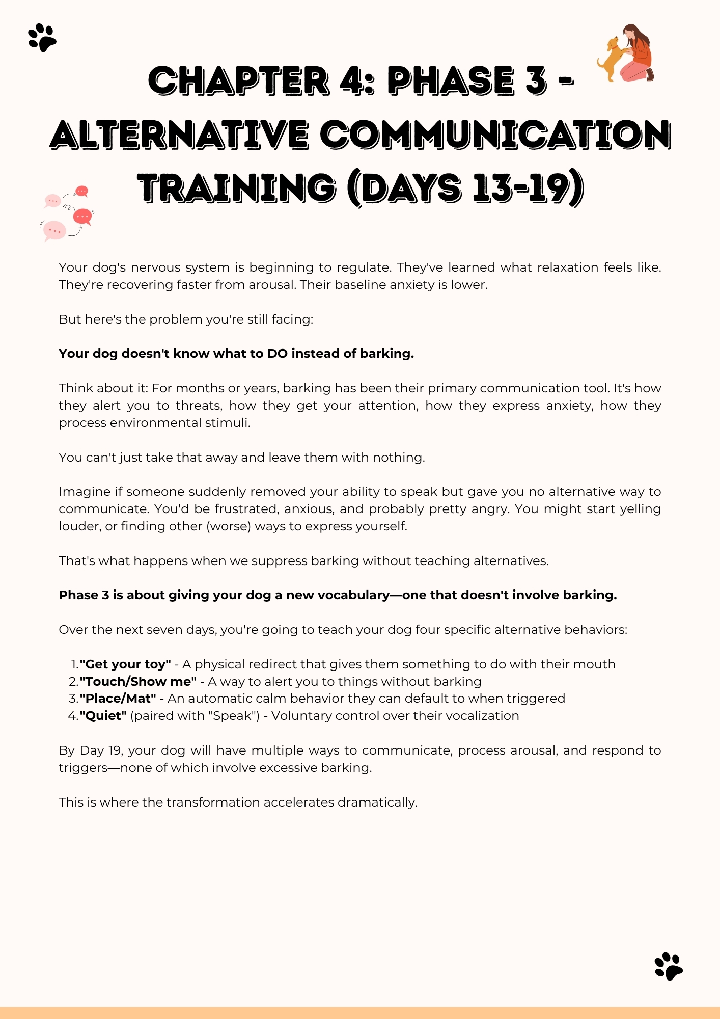 Simple, clear, and it works. No shouting or weird gadgets — just real understanding of why dogs bark. My labrador is finally quiet when the postman comes!